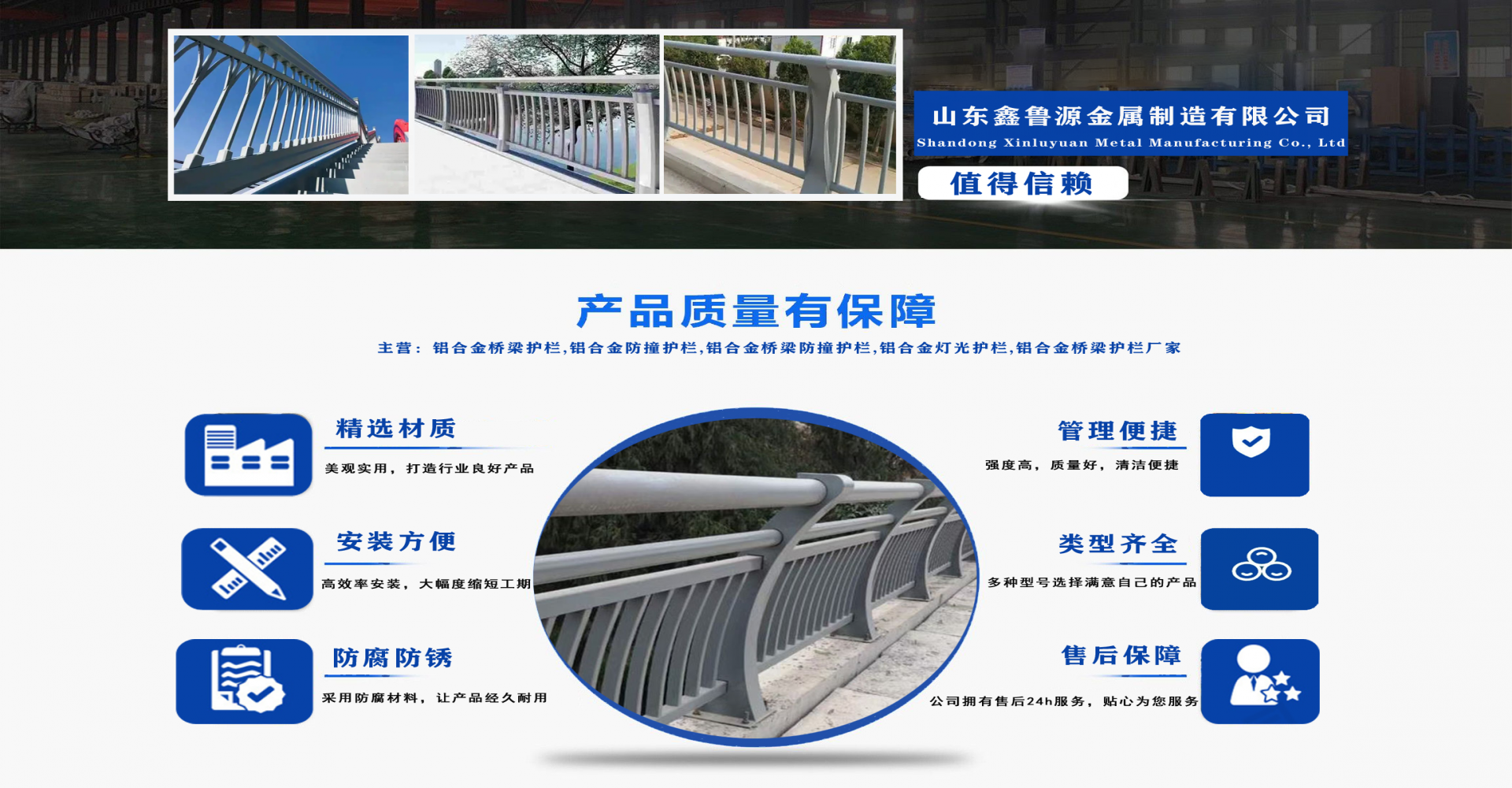 山東鑫魯源金屬制造有限公司主要經營:鋁合金橋梁護欄,鋁合金防撞護欄,鋁合金橋梁防撞護欄,鋁合金燈光護欄,不鋁合金橋梁護欄廠家,環(huán)波梁橋梁護欄,環(huán)波梁防撞護欄。質量可靠、經濟實用的顯著特點。公司為客戶提供可靠售后保障,堅持“以品質立足、服務求發(fā)展”,愿與各界朋友精誠合作、攜手發(fā)展! 服務優(yōu)勢:真誠的服務理念、完善的服務體系。公司專業(yè)力量充足;工程案例眾多、從業(yè)經驗豐富;公司以可靠質量的產品,合理的價格,完善的售后服務,能夠滿足市場各個企業(yè)的需求。 企業(yè)精神:執(zhí)著追求 持續(xù)創(chuàng)新執(zhí)著追求,就是堅持不懈、堅定從容,專注于自己的事業(yè),把能做的事情做好,不斷克服困難、把握機遇,贏得未來。 持續(xù)創(chuàng)新,就是生命不息、創(chuàng)新不止,通過持續(xù)實施技術創(chuàng)新、管理創(chuàng)新、市場創(chuàng)新,獲取持續(xù)的競爭優(yōu)勢。...